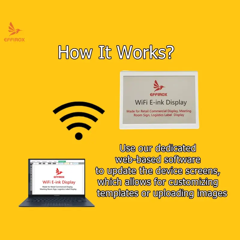 Effirox Wi-Fi E-Ink Displays break the mold. Engineered for ultra-low power consumption, they maintain a constant Wi-Fi connection for genuine remote management, without the need for a dedicated base station. Achieve one-year battery life on a single charge and update screens instantly from anywhere via web portal. Ideal for smart offices, hospitals, and factories seeking a truly wireless, scalable solution.