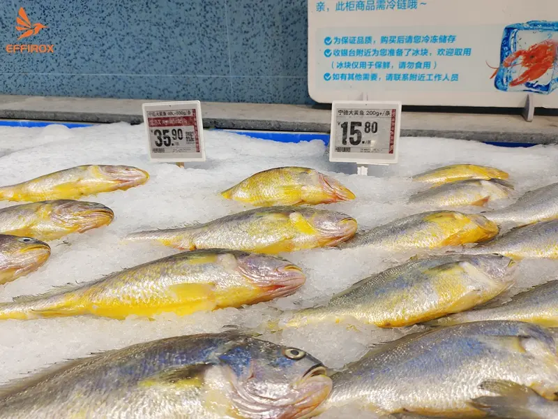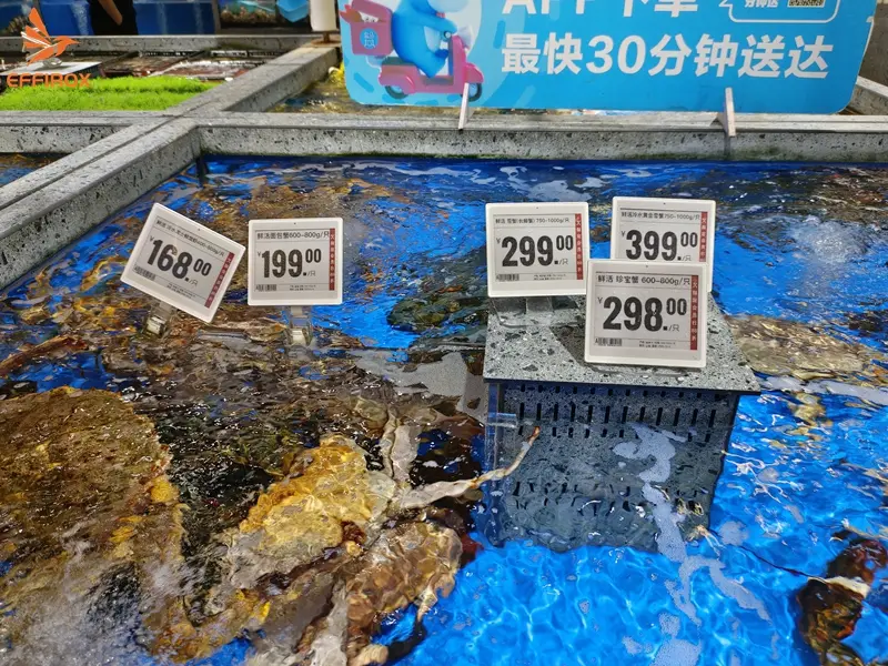Wasserdichte Preisschilder: In Bereichen wie Fisch oder frischem Gemüse, in denen Feuchtigkeit vorherrscht, sind Effirox’ wasserdichte elektronische Preisschilder gegen Nässe und hohe Luftfeuchtigkeit resistent und gewährleisten eine durchgängig klare Preisanzeige ohne Schäden.